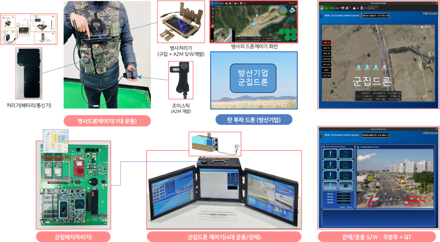 본 제품의 군집드론 통제는 우분투 환경에서 개발되었고, 단위 드론의 운용을 위한 통제 소프트웨어는 안드로이드 기반으로 개발되었습니다. 특히, 통제소에서 직접 수신한 원격영상을 기반으로 GPU가 아닌 에지 AI 처리기를 기반으로 물체를 탐지하고 운용자 화면에서 결과를 전시하는 기능까지도 포함되어 있습니다.