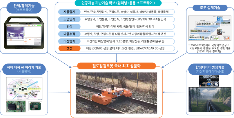 철도점검로봇은 철도안전의 요소로서 선로를 사람이 육안으로 점검하는 기능을 로봇이 대신하는 목적으로 개발된 제품입니다. 12개의 카메라와 2개의 3D 라이다를 기반으로 환경과 선로에 대한 이상탐지를 수행하고 원격의 운용자에게 자동으로 경고하는 기능이 포함되어 있습니다.특히, 본 장비는 7개의 NPU/AP, 1개의 CPU/GPU 그리고 제어기능의 백업을 위한 Dual 제어기를 기반으로 구성되어 있으며 배터리를 기반으로 3시간 이상 운용이 가능합니다. 4개의 모터를 기반으로 제작되었지만 고장 등 백업을 위하여 평소 2개의 모터만으로도 정상운용이 가능하고 특정 모터 1개 혹은 2개가 고장 날 경우 자동백업으로 운용된다.본 장비는 체결구, 이음매, 궤도표면 등의 이상탐지와 주행환경에 영향을 미치는 낙석, 유실물 인입, 지장물탐지, 자갈높이, 사면유실 등 선로주행에 영향을 미치는 환경요소의 문제를 자동으로 탐지 혹은 측정하여 원격의 운용자 혹은 다른 관리자에게 통보하는 등 신뢰도 높은 안전을 확보한 완전자율주행로봇으로 개발되었습니다.국내에서는 최초로 선로자율주행 측면에서 철도형식승인을 통과하여 생산을 진행중에 있습니다.